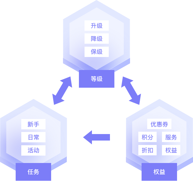 任务、等级、权益,积分相互流转,给用户正向激励,提升用户活跃度。