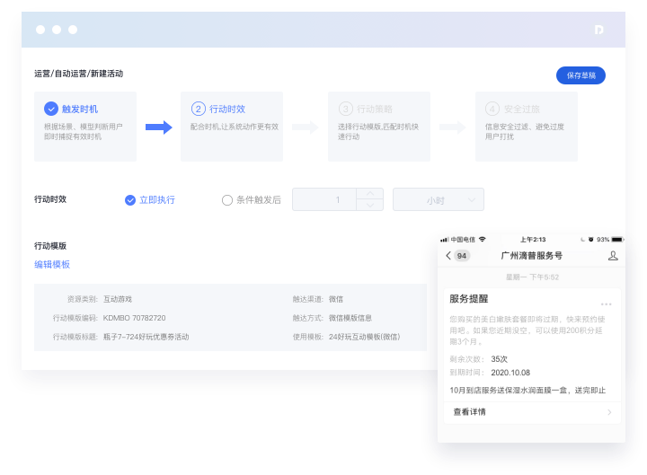 自动化的营销旅程能力,基于标签及算法模型的支撑,智能触发营销事件,有效释放企业运营人力。