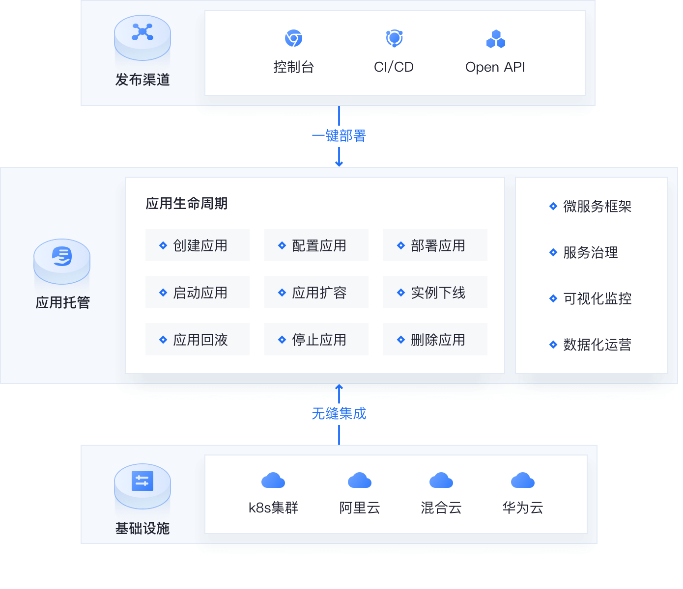 包含应用创建、配置应用、应用扩缩、无损下线、应用回滚、删除应用等全生命周期的管理。
